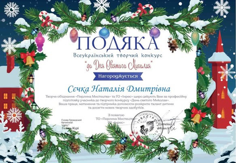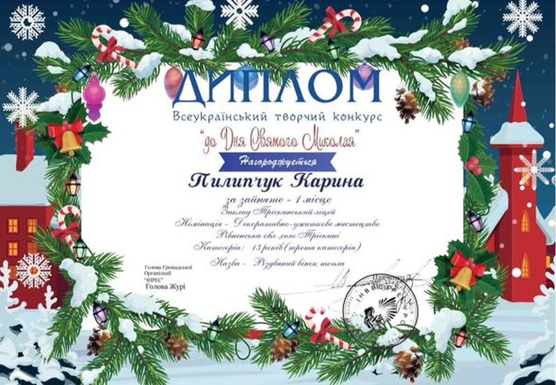 I місце у Всеукраїнському творчому конкурсі ,,До Дня Святого Миколая"