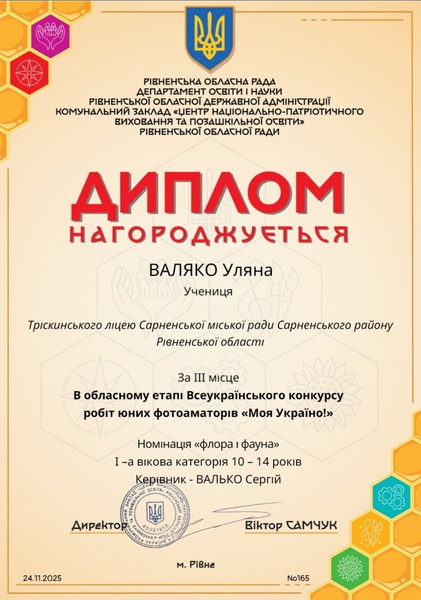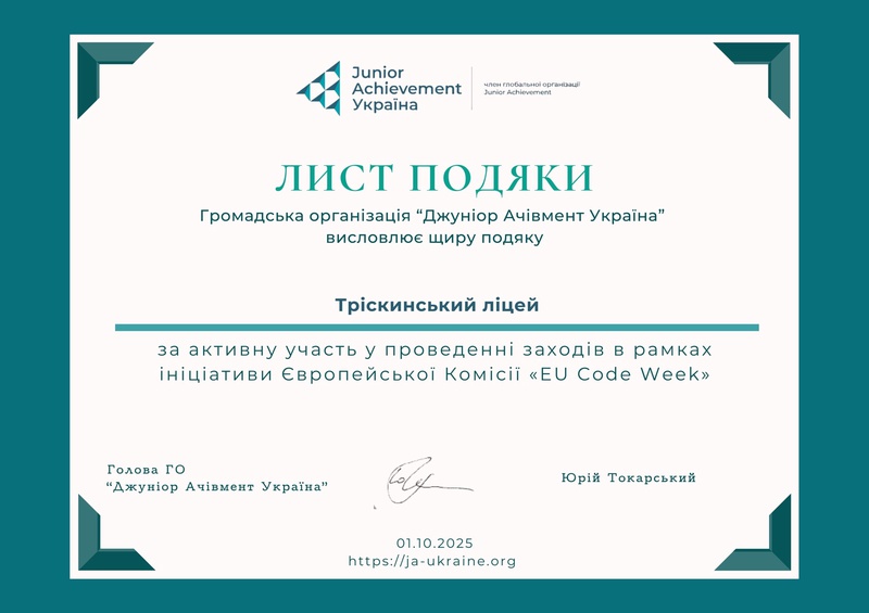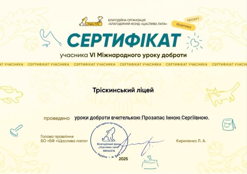 Сертифікат Тріскинському ліцею.